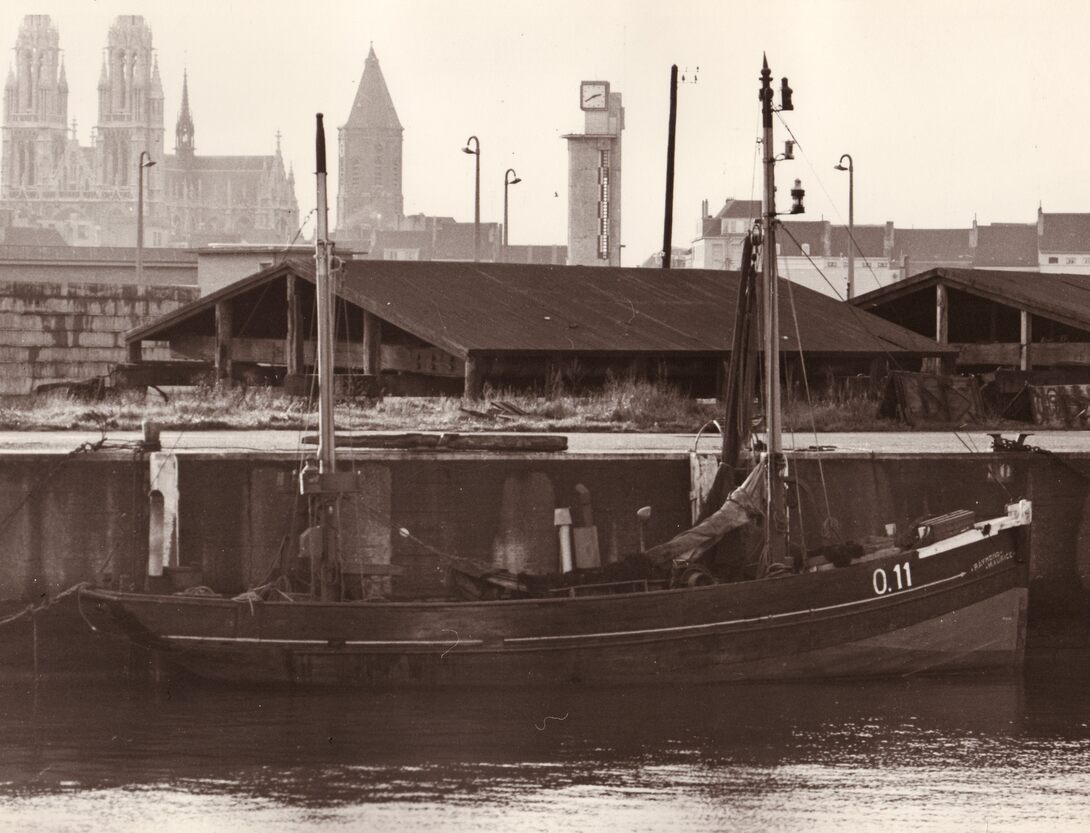 Vissersboten, o.a. de O.242 "Jeanne Maria" vertrekkensklaar in de sluis van het Visserijdok.