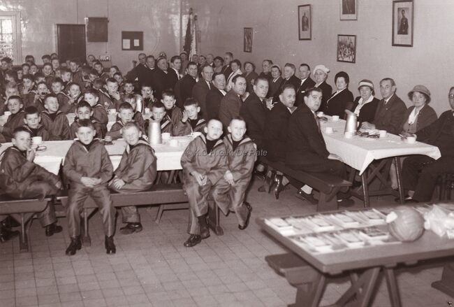 De eetzaal van de Ibisschool tijdens de ontvangst van Prins Alexander naar aanleiding van vijftig jaar Ibis op 30 oktober 1956. Rechts naast de Prins, de voorzitter Ernest-John Solvay, Willy Weemaes, secretaris van…