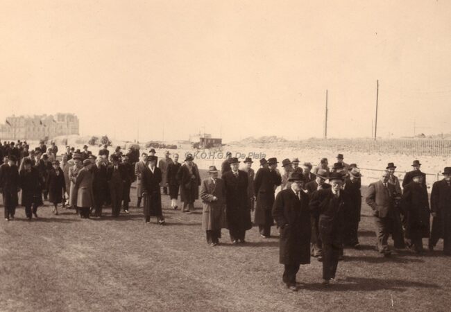 Premier Achiel Van Acker en andere notabelen op de Oostendse renbaan bij de eerste steenlegging van de heropbouw na de oorlog. Rechts de Koningin Astridlaan,op de achtergrond de 17 Oktoberstraat.
