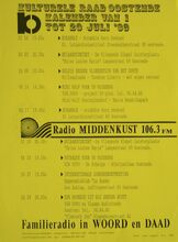 Formaat: 48 x 35 cm. 15apr: "Ruilbeurs voor verzamelaars, hobbyklub Oostende. Voordracht: 'De werken aan de Sint Petrus en Pauluskerk'". "Toneelvoorstelling: De twee maagden", toneel en kultuurkring Neptunus. "Toneelvoorstelling: Nachtmerries" van paul Copens, Regie: Roland Struys, toneelkring De Troebadoers. 16 apr: "Zeepolderroute". 17apr: "Voordracht met dia: 'Granada, parel van Andalusië'" door dhr. Jan Deceuninck, Vlaams Verbond voor Gepensioneerden. "Scrabble". "Voordracht: 'Synthese of versnippering - Modernisme en post- modernisme?'". 18apr: "Voordracht: Chinese geneeskunde: Accupunctuur" door dhr. E. Desmadryl, Federatie Vlaamse Vrouwen. 20apr: "Diamontage: Een zwerftoch door Devon"door dhr. Coenye. "Video- avond: zangfeest 1988" met spreker A. N. Z.. "Algemene vergadering van de Kulturele Raad Oostende". 21apr: "Voorddracht: Algemene hygiëne en lichaamsverzorging" door Mevr. Nicole Vandenbossche. "Cursus filosofie: Filosofie van de gevoelens/ vervreemding" door L. Apostel. en J. Walry. "Diamontage Europees Parlement en vragenspel rond Europa" KWB Centrum Oostende. "Hommage aan Brassens" door Koen De Cauter Kwartet, Centrum Bob Claessens. 22apr: "Ensemble Louis Pas" Jeugd en Muziek Oostende. 24apr: "Voordracht: Gezond vlees?" door Mevr. C. Beerlandt. 25 apr: "Voordracht: Europa '92 " door Jaak Vandemeulebroucke. "Panel- gesprek met media- moderator 'Kopje onder in 1992?' " "Film: 'La vie est un longue fleuve tranquille' ", vzw De Sierk. "Dia- avond: Pourrons- nous débarraser la planète de certains virus?" door Mevr. Thiry, uitstraling VUB- UPV. 26apr: "Voordracht: Opkomen voor jezelf" door Ann Delye, psychologe. 27 apr: "Groepsbezoek: DIRV- dag te Gent - bezoek Flanders Technology CMBV". "Geleid bezoek PMMK 'August De Smet' " "Voordracht: Het OCMW en zijn dienstverlening" vzw VOVO. "Gesprekavond: Japan - Esperanto-grupo 'La Konko'. "Voordracht: Het watervliegveld van Oostende" door dhr. W. Major, Oostendse Heemkring De Plate. 27, 28 en 29: "Toneelvoorstelling: Equus" door De Bacchanten, Blaamse Klub Kust. 28 apr: "Cursus filosofie: Uibuiting en onderdrukking" door L. Apostel en J. Walry. "Voordracht: Zaïre -België en Moboetoe" door Walter Zinzen, BRT- journalist. "Voordracht: Stene en Oostende" door dhr. Jan Dreesen. 29apr: "Groepsbezoek en afdaling steenkoolmijnen van Zoler" vzw De Sierk. 30apr: "Busexcursie naar het Meerdaalwoud" de Wielewaal oostende. "Natuurwandeling met gids", KAV Vuurtoren. "Concert Accordeonklas Kon. Conservatorium van Antwerpen" Jeugd en Muziek Oostende. 1jun: "Wandeling: ontwaken van het Zwin" Federatie Valamse Vrouwen.