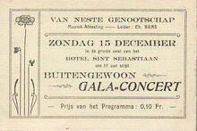Op zondag 31 maart 1918 (Pasen) in Hotel St.-Sebastiaan ten voordele van de behoeftige Oostendse krijgsgevangenen in Duitsland met de welwillende medewerking van de toneelafdeling van het Van Neste Genootschap en het Philantropisch orkest Fritz