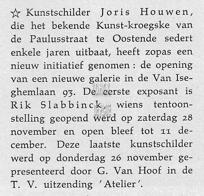Trefwoorden HOUWEN JORIS (1925-1998) (KUNSTSCHILDER)GALERIE HOUWEN (KUNSTGALERIJ)KUNSTGALERIJENVAN ISEGHEMLAAN Auteurs Smeets Albert