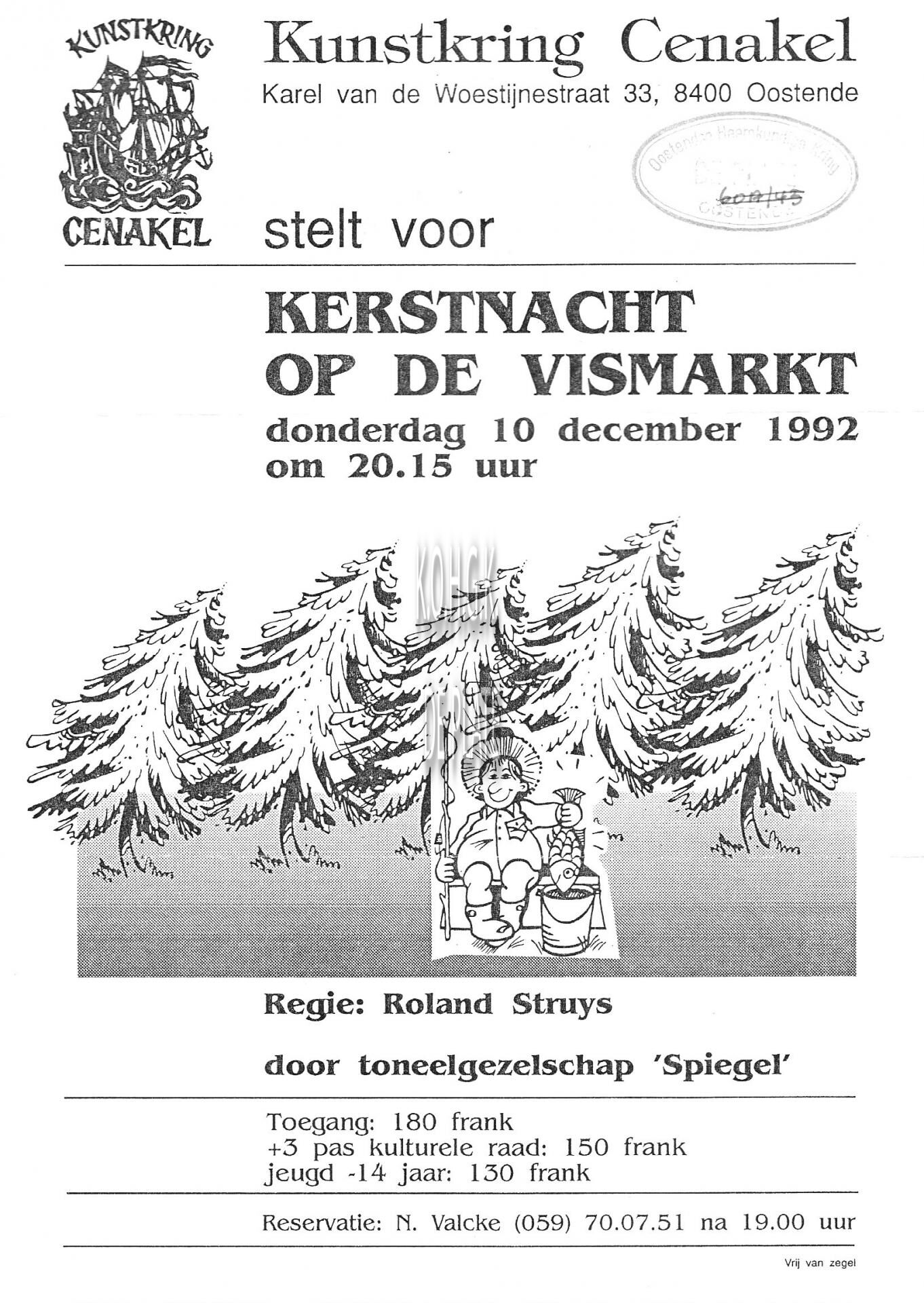 Aankondiging : Kunstkring Cenakel stelt voor toneelgezelschap Spiegel. Kerstnacht op de Vismarkt. Zaal Cenakel. 10/12/1992