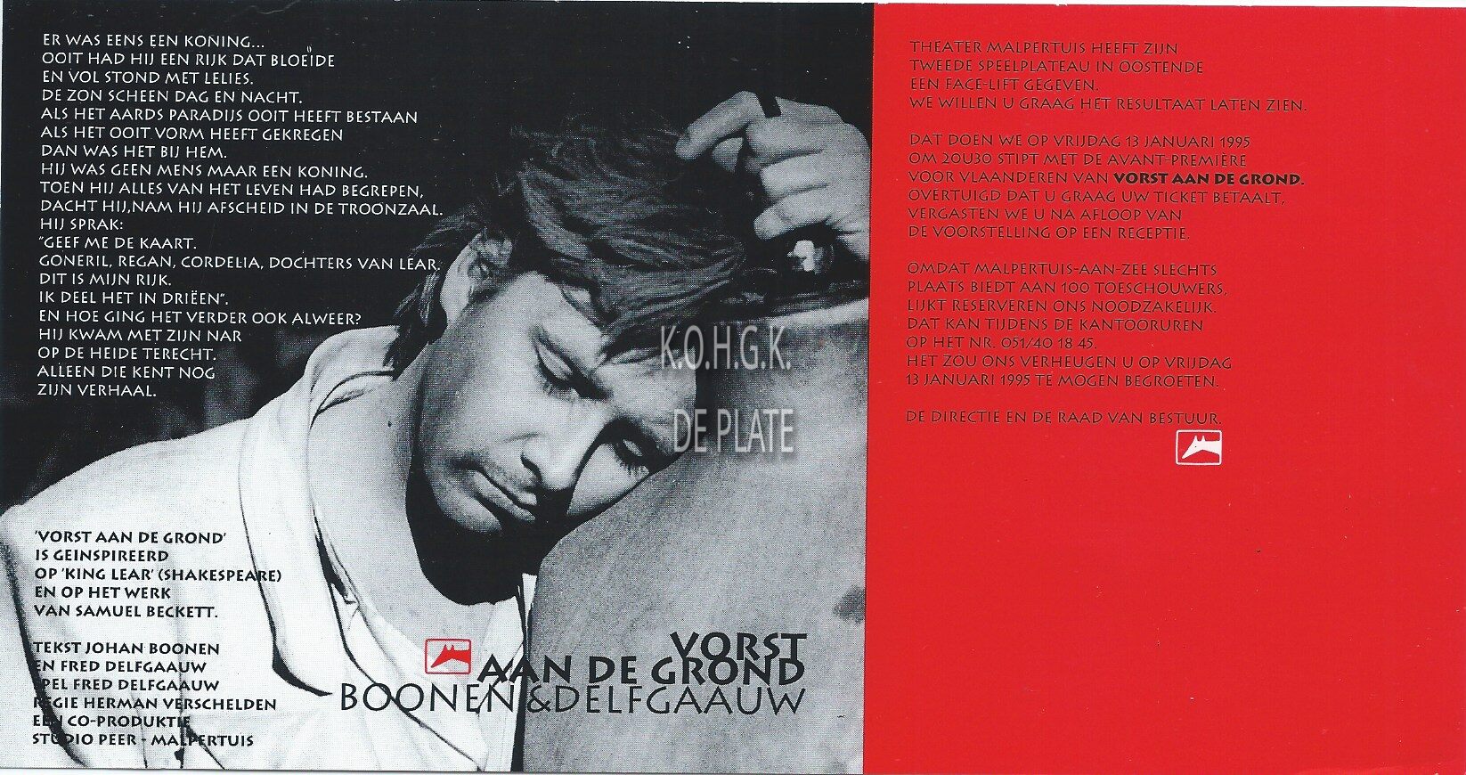 Omschrijving door Johan Boonen en Fred Delfgaauw. Regie : Herman Verschelden Trefwoorden KLEIN DRUKWERK THEATER MALPERTUIS TIELT VORST AAN DE GROND (TONEELSTUK) TONEELSTUKKEN BOONEN JOHAN (AUTEUR) DELFGAAUW FRED (AUTEUR) VERSCHELDEN HERMAN (TONEELREGISSEUR) ZAAL MALPERTUIS Plaatskenmerk ARCHIEF 110 ARCHIEFDOOS KUNSTEN Inventarisnummers 2022/0015 13/ 01/ 1995 Print