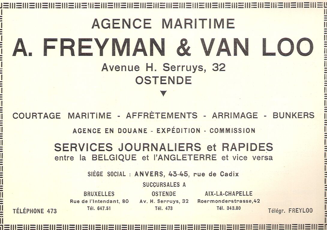 Trefwoorden ADVERTENTIES ; ZEEVAART A. FREYMAN EN VAN LOO (SCHEEPSMAKELAAR SCHEEPSBEVRACHTER) ZEEVAART ; SCHEEPSMAKELAARS ZEEVAART ; SCHEEPSBEVRACHTERS HENDRIK SERRUYSLAAN Plaatskenmerk A611 Inventarisnummers 2013/0647 Deelbeschrijving uit boek of document Ostende et le Littoral Belge 1932 Auteurs Anoniem Pagina 138 Print