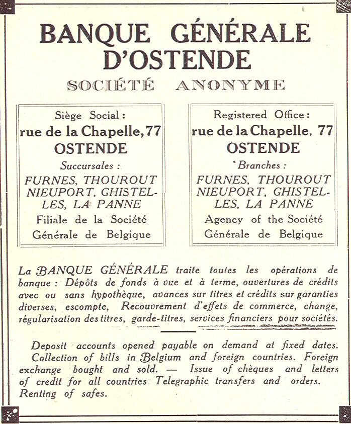 Trefwoorden GENERALE BANK - BANQUE GENERALE D'OSTENDE ADVERTENTIES ; BANKWEZEN KAPELLESTRAAT Plaatskenmerk A525 Inventarisnummers 2012/3079 Deelbeschrijving uit boek of document Ostende : reine des plages = queen of seaside resorts Auteurs Anoniem Pagina [14] Print