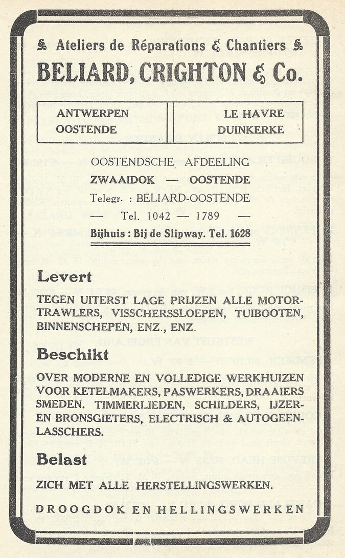 Ateliers de Réparations & Chantiers. Antwerpen. Le Havre. Oostende. Duinkerke. Levert tegen uiterst lage prijzen alle motortrawlers, visscherssloepen, tuibooten, binnenschepen, enz. Beschikt over moderne en volledige werkhuizen voor ketelmakers, paswerkers, draaiers, smeden, timmerlieden, schilders, ijzer- en bronsgieters, electrisch en autogeen lasschers. Belast zich met alle herstellingswerken. Droogdok en hellingswerken. Bijhuis : Bij de Slipway