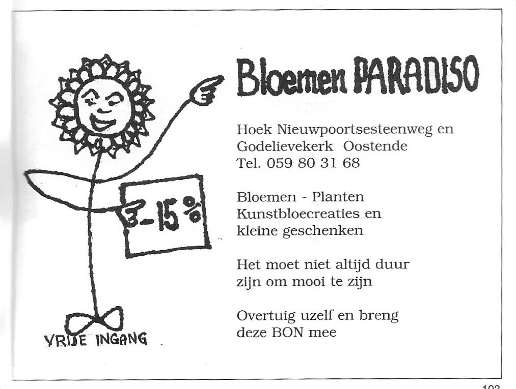 Trefwoorden ADVERTENTIES ; HANDEL BLOEMEN PARADISO (BLOEMENHANDEL) NIEUWPOORTSESTEENWEG Plaatskenmerk MUSEUMDEPOT 117.7 A14 D2 Deelbeschrijving uit boek of document Programma : Mo gow zeg 2006 Pagina 103 Print