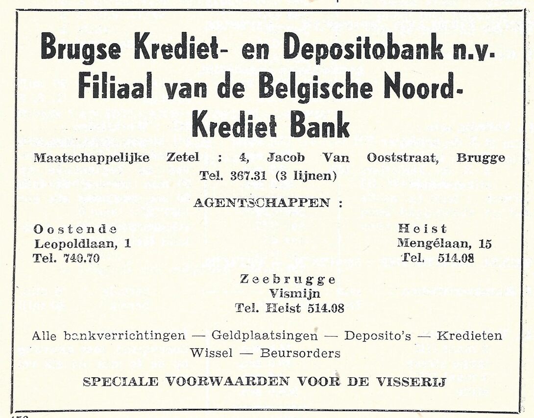 Maatschappelijke zetel : 4, Jacob Van Ooststraat, Brugge. Agentschappen : Oostende : Leopoldlaan 1. Heist : Mengélaan 15. Zeebrugge : Vismijn. Alle bankverrichtingen - Geldplaatsingen - Deposito's - Kredieten - Wissel - Beursorders. Speciale voorwaarden voor de visserij