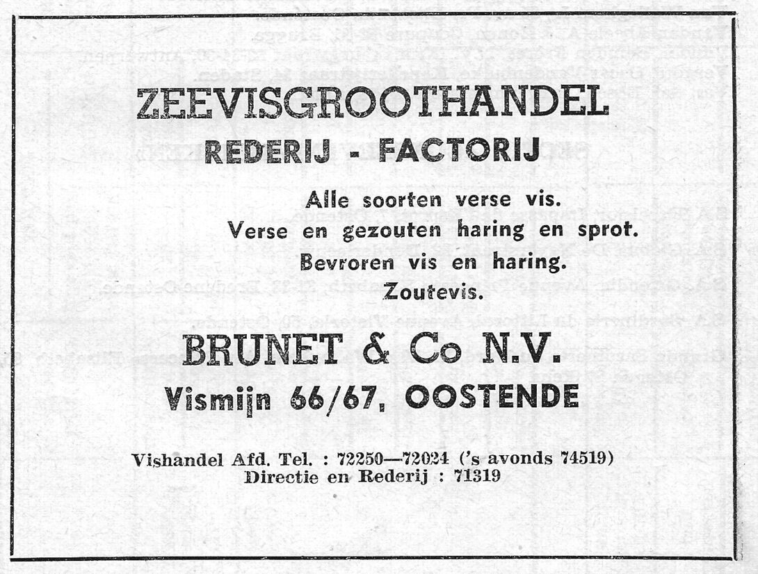 Advertentie : Brunet en C° NV. Zeevisgroothandel - Rederij - Factorij. Vismijn 66-67, Oostende.