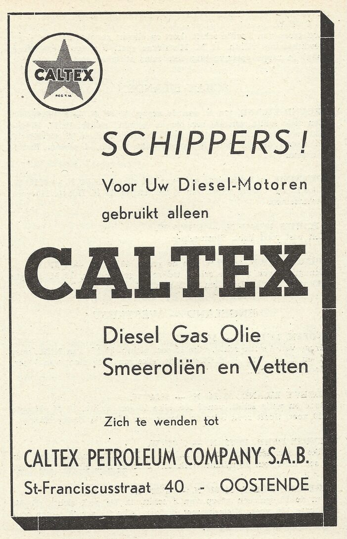 Schippers ! Voor uw diesel-motoren gebruikt alleen CALTEX. Diesel, gas, olie, smeeroliën en vetten. Zich te wenden tot Caltex Petroleum Company SAB. Sint-Franciscusstraatr 40, Oostende.