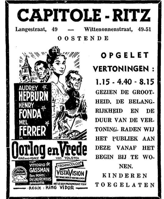 Omschrijving De eerste film gespeeld in de nieuwe cinema Capitole. Met Audrey Hepburn, Henry Fonda en Mel Ferrer Trefwoorden OORLOG EN VREDE (FILM) FILMS CINE CAPITOLE (CINEMA) HEPBURN AUDREY (1929-1993) (FILMACTRICE) FONDA HENRY (1905-1982) (FILMACTEUR) FERRER MEL (1917-2008) (FILMACTEUR) ADVERTENTIES ; CINEMA'S Plaatskenmerk O.D.P.-archieven. Bibliotheek Kris Lambert 17-04-1957 Bron Het Kustblad Pagina's 2 Print