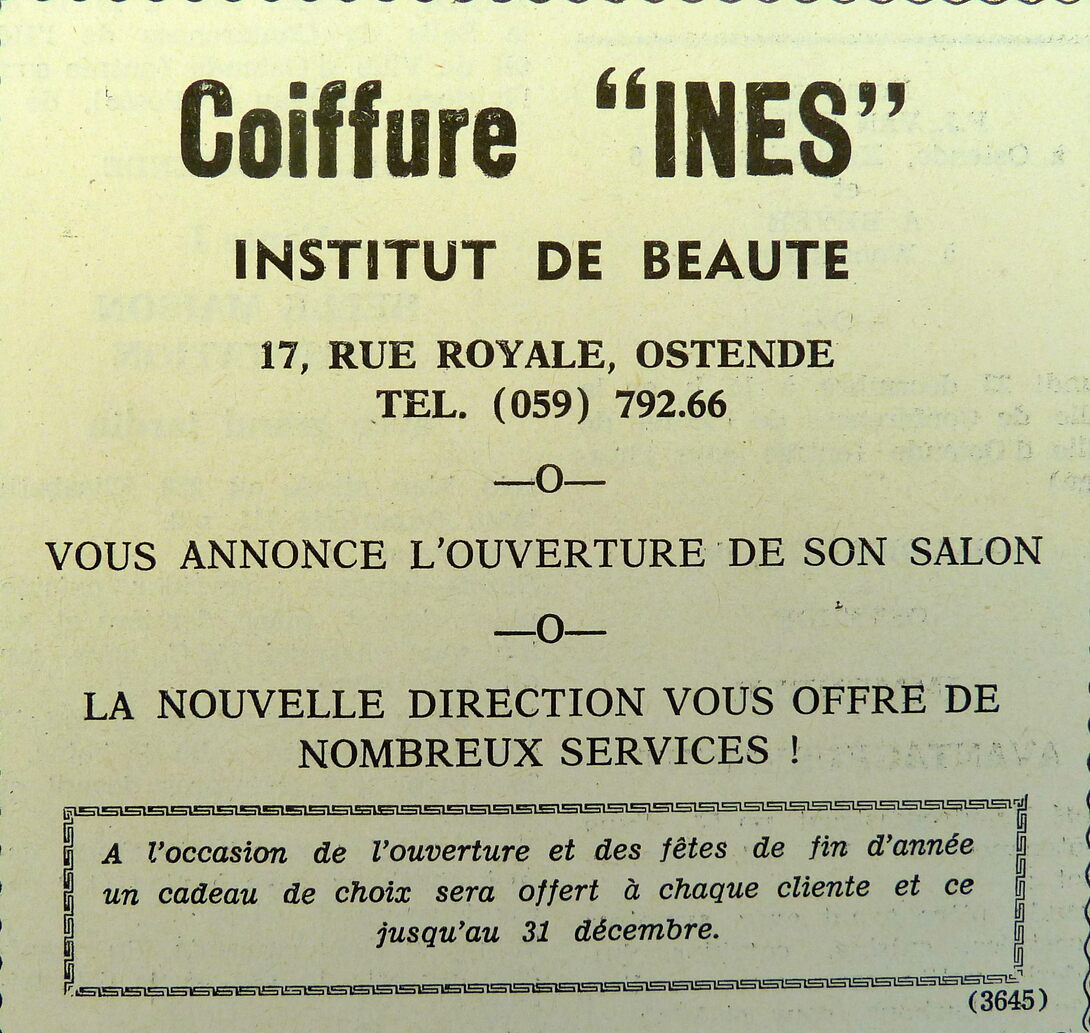 Trefwoorden ADVERTENTIES ; LICHAAMSVERZORGING COIFFURE INES (KAPSALON) KONINGSSTRAAT Plaatskenmerk ARCHIEF 117.8 B35 COUR1968 13-12-1968 Auteurs Anoniem Bron Le Courrier du Littoral Pagina's 11 Print