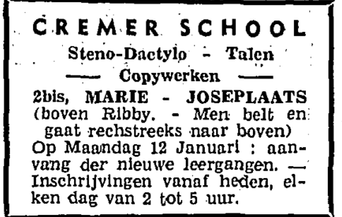 Omschrijving Stene-dactylo. Talen. Copywerken Trefwoorden ADVERTENTIES ; ONDERWIJS CREMER SCHOOL MARIE-JOSEPLEIN Plaatskenmerk O.D.P.-archieven. Bibliotheek Kris Lambert 13-12-1941 Bron Het Strand Pagina's 2 Print