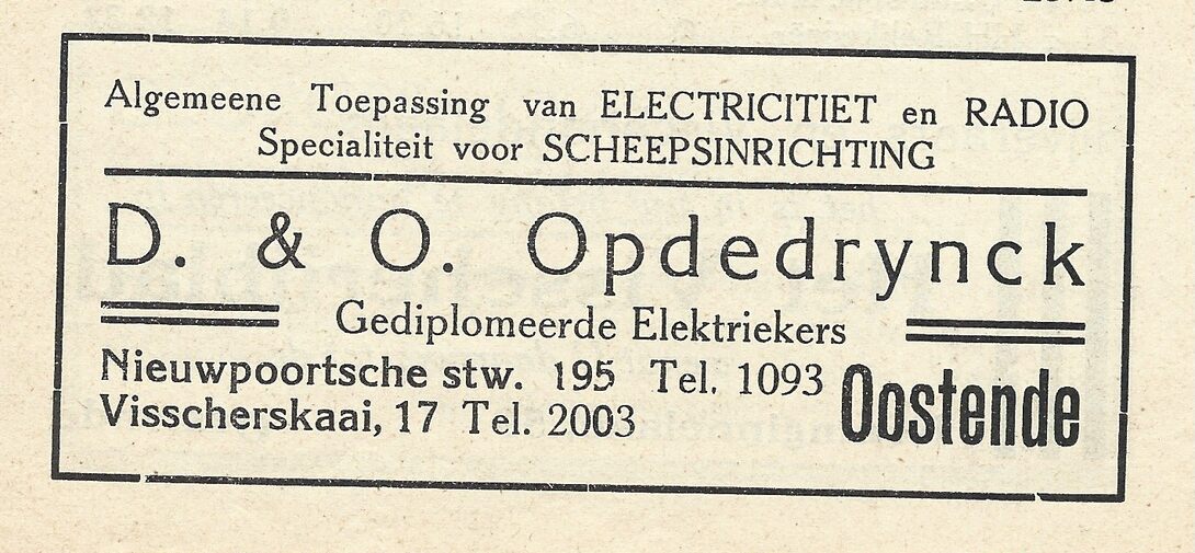 Advertentie : D. & O. Opdedrynck. Gediplomeerde Elektriekers. Nieuwpoortsesteenweg 195 en Visserskaai 17 Oostende