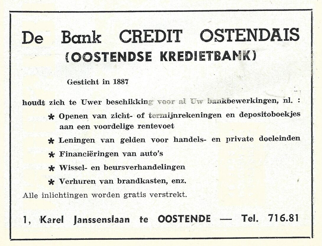Gesticht in 1887. houdt zich ter uwer beschikking voor al uw bankbewerkingen, nl. : Openen van zicht- of termijnrekeningen en depositoboekjes aan een voordelige rentevoet. Leningen van gelden voor handels- en private doeleinden. Financiëringen van auto's. Wissel- en beursverhandelingen. Verhuren van brandkasten, enz. Alle inlichtingen worden gratis verstrekt.