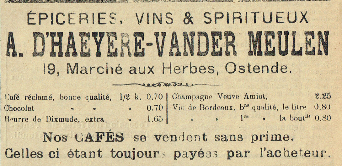 Trefwoorden ADVERTENTIES ; HANDEL A. D'HAEYERE-VANDERMEULEN (KRUIDENIERSZAAK WIJN- EN DRANKENHANDEL) GROENTEMARKT Plaatskenmerk DIGI ARCHIEF KRANTEN 18-05-1907 Bron L'Echo d'Ostende Pagina's 4 Print