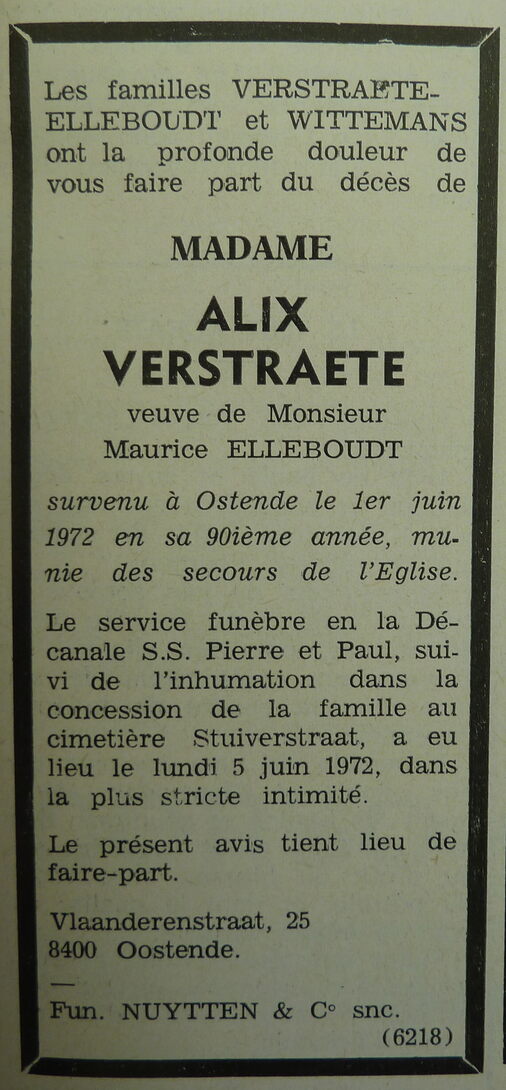Advertentie : Doodsbericht Alix Verstraete, veuve de Maurice Elleboudt
