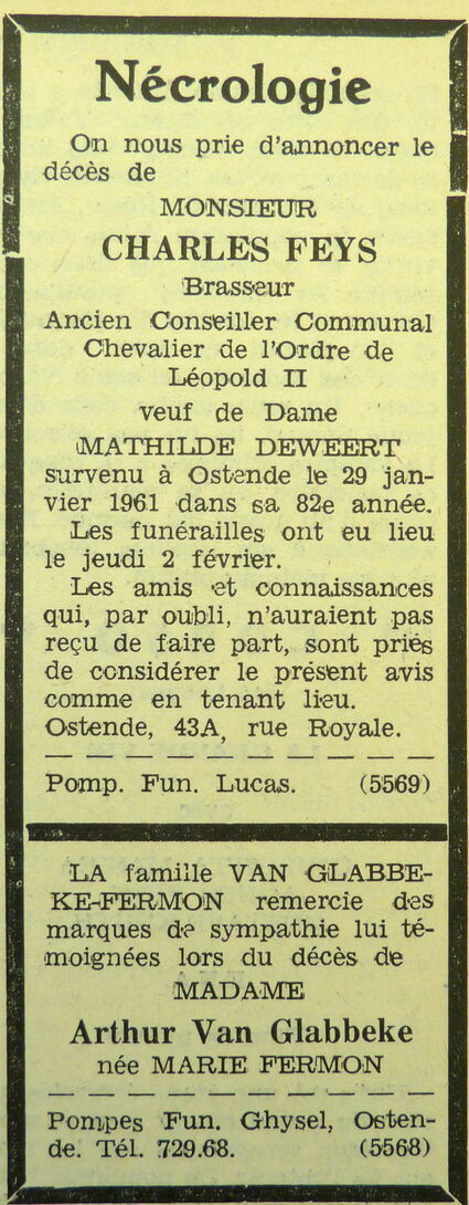 Trefwoorden ADVERTENTIES ; DOODSBERICHTEN FEYS CHARLES (1878-1961) (BROUWER) Plaatskenmerk ARCHIEF 117.8 B35 COUR1961 03-02-1961 Bron Le Courrier du Littoral Pagina's 7 Print