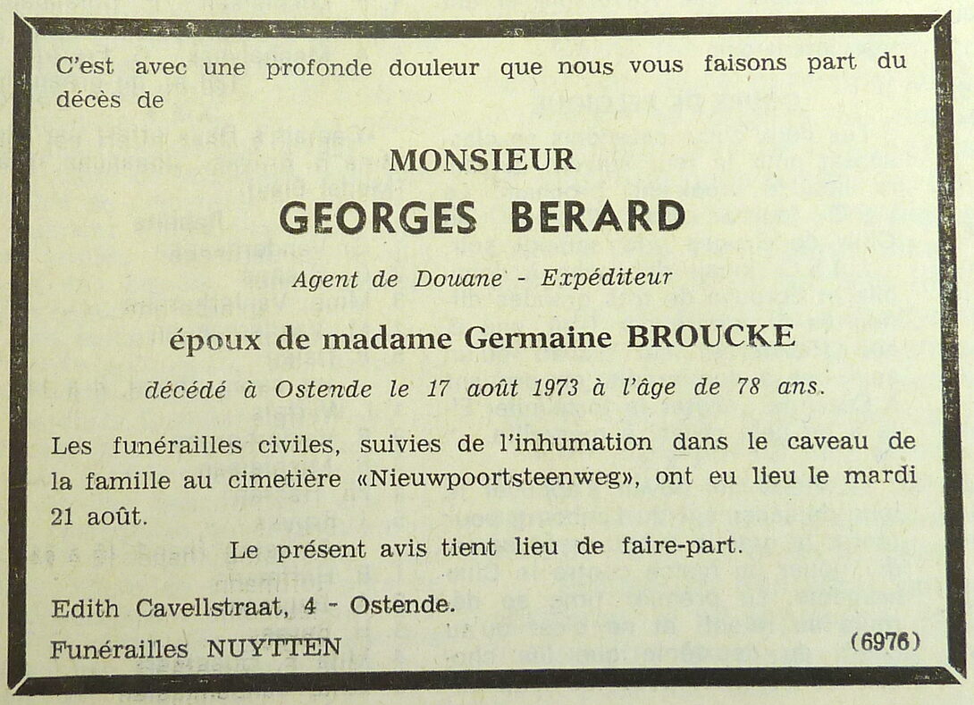 Omschrijving Echtgenoot van Germaine Broucke Trefwoorden BERARD GEORGES (SCHEEPSAGENT) DOODSBERICHTEN Plaatskenmerk ARCHIEF 117.8 B35 COUR1973 24-08-1973 Bron Le Courrier du Littoral Pagina's 5 Print
