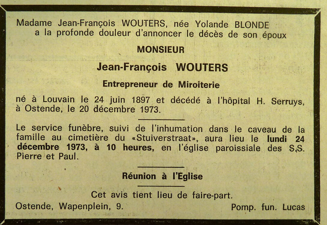 Trefwoorden DOODSBERICHTEN WOUTERS FRANS (JEAN-FRANCOIS) (1897-1973) (GLASHANDELAAR) Plaatskenmerk ARCHIEF 117.8 B35 COUR1973 21-12-1973 Bron Le Courrier du Littoral Pagina's 15 Print