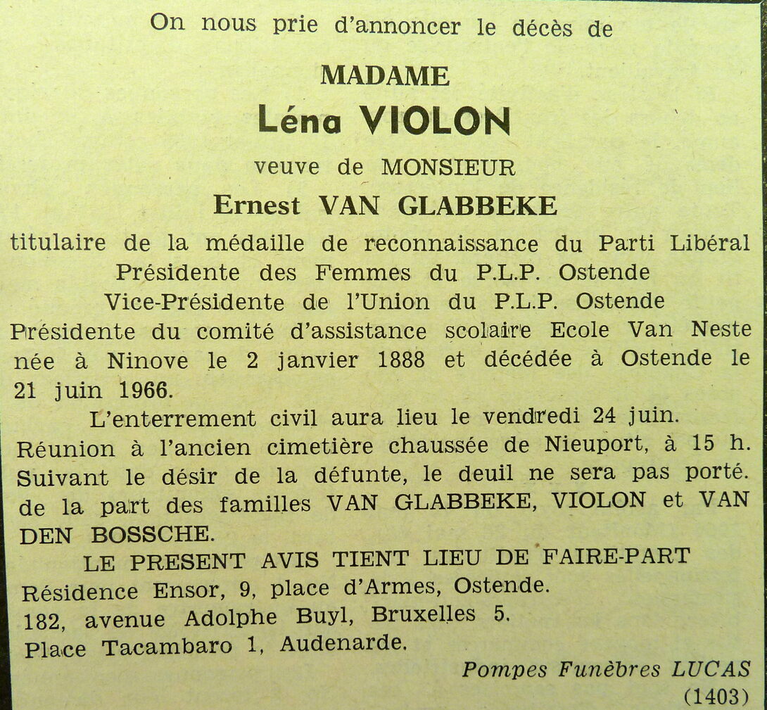 Omschrijving Weduwe van Ernest Van Glabbeke Trefwoorden ADVERTENTIES ; DOODSBERICHTEN VIOLON LENA (1888-1966) Plaatskenmerk ARCHIEF 117.8 B35 COUR1966 24-06-1966 Auteurs Anoniem Bron Le Courrier du Littoral Pagina's 7 Print