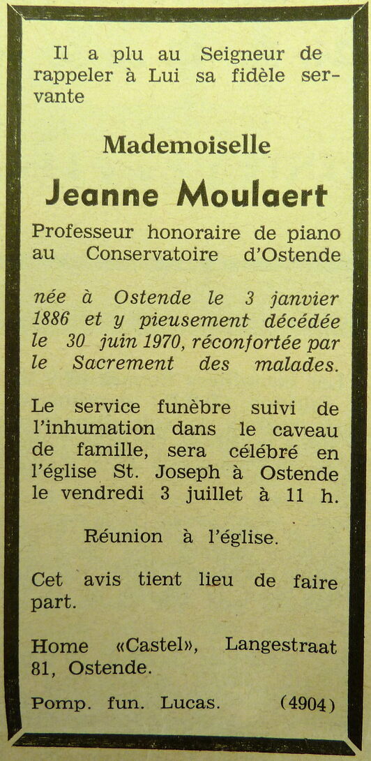 Trefwoorden ADVERTENTIES ; DOODSBERICHTEN MOULAERT JEANNE (1886-1970) (MUZIEKLERARES) CONSERVATORIUM (MUZIEK) Plaatskenmerk ARCHIEF 117.8 B35 COUR1970 03-07-1970 Auteurs Anoniem Bron Le Courrier du Littoral Pagina's 4 Print