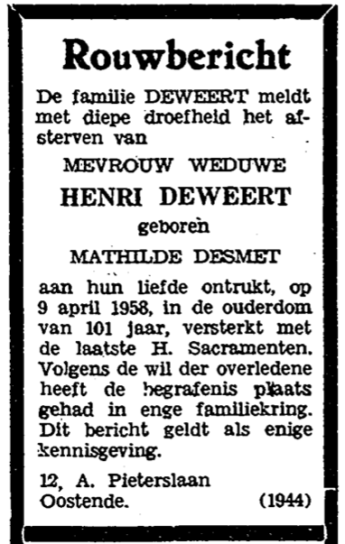 Trefwoorden ADVERTENTIES ; DOODSBERICHTEN DESMET MATHILDE (1856-1958) (WEDUWE HENRI DEWEERT) HONDERDJARIGEN Plaatskenmerk O.D.P.-archieven. Bibliotheek Kris Lambert 16-04-1958 Bron Het Kustblad Pagina's 2 Print