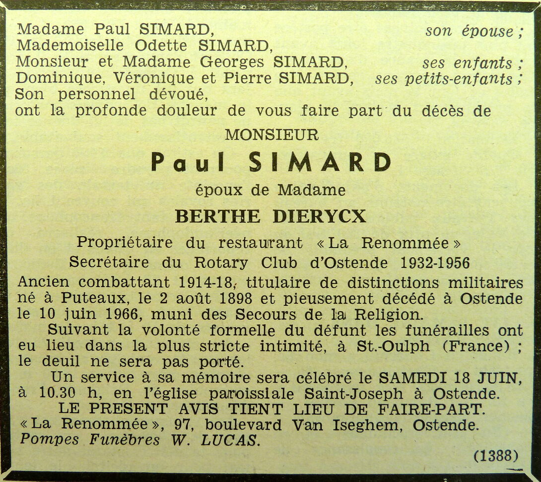 Trefwoorden ADVERTENTIES ; DOODSBERICHTEN SIMARD PAUL (1898-1966) (RESTAURANTHOUDER) LA RENOMMEE (RESTAURANT) (VAN ISEGHEMLAAN) HORECAZAKEN Plaatskenmerk ARCHIEF 117.8 B35 COUR1966 17-06-1966 Auteurs Anoniem Bron Le Courrier du Littoral Pagina's 7 Print