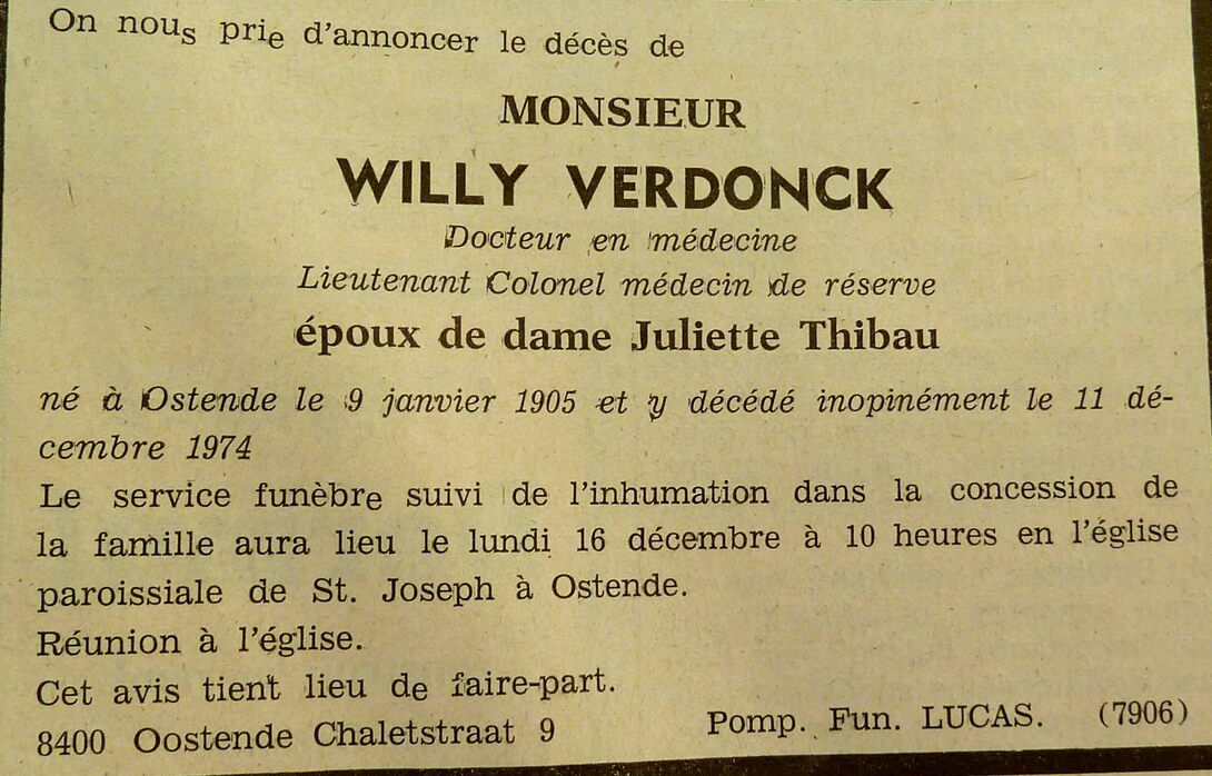 Trefwoorden ADVERTENTIES ; DOODSBERICHTEN VERDONCK WILLY (GENEESHEER) Plaatskenmerk ARCHIEF 117.8 B35 COUR1974 13-12-1974 Bron Le Courrier du Littoral Pagina's 7 Print