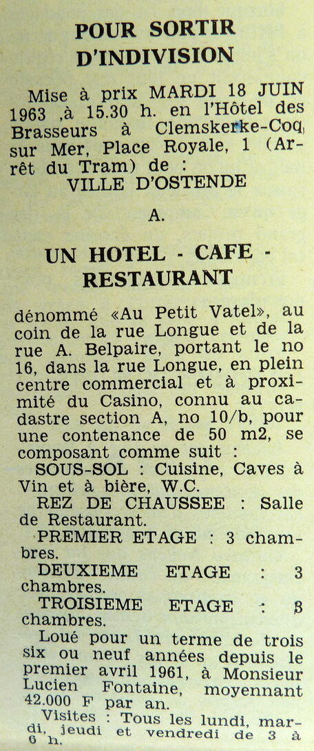 Advertentie : Etude du notaire Edgard Van Hove. Vente publique. Un hotel, café, restaurant "Au Petit Vatel"