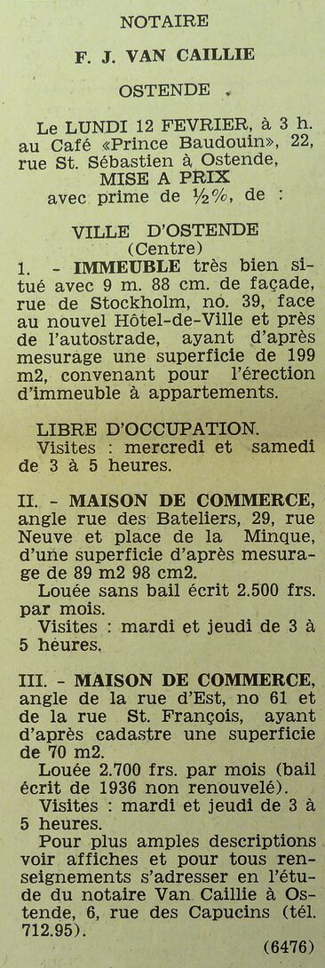 Advertentie : Etude du notaire F.J. Van Caillie. Vente publique. I. Immeuble, II. Maison de commerce, III. Maison de commerce
