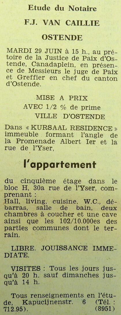 Trefwoorden ADVERTENTIES ; VERKOPINGEN APPARTEMENT IJZERSTRAAT 30A RESIDENTIE KURSAAL (IJZERSTRAAT) APPARTEMENTEN Plaatskenmerk ARCHIEF 117.8 B35 COUR1965 18-06-1965 Auteurs Anoniem Bron Le Courrier du Littoral Pagina's 12 Print