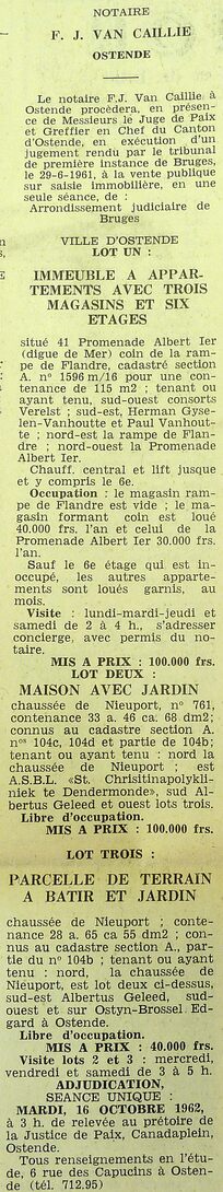 Advertentie : Etude du notaire F.J. Van Caillie. Vente publique. Lot 1 : Immeuble à appartements avec trois magasins et six étages. 41 Promenade Albert Ier, Lot 2 : Maison avec jardin. chaussée de Nieuport 761, Lot 3 : Parcelle de terrain à bâtir et ...