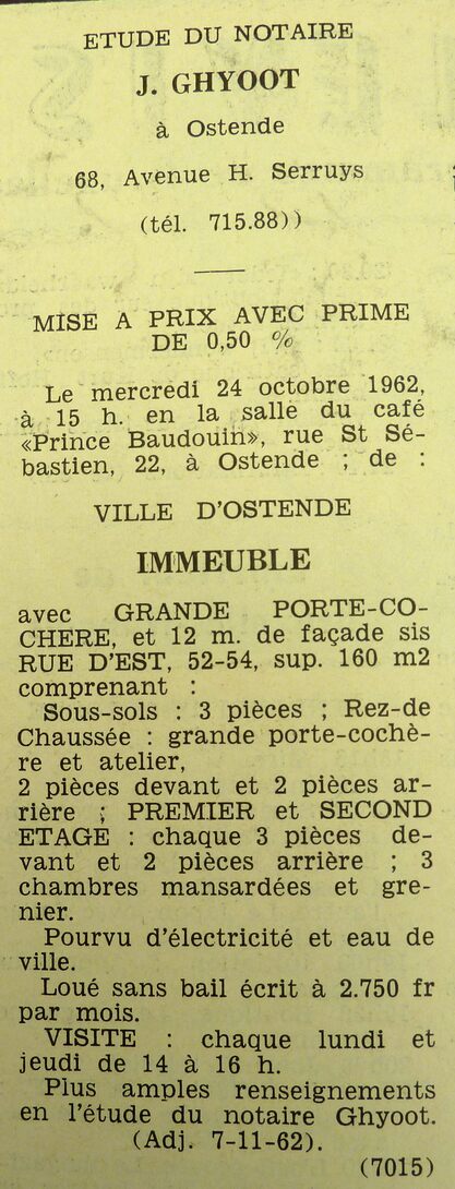 Omschrijving Woning met grote koetspoort. Trefwoorden ADVERTENTIES ; VERKOPINGEN WONING OOSTSTRAAT 52-54 WONINGEN Plaatskenmerk ARCHIEF 117.8 B35 COUR1962 12-10-1962 Auteurs Anoniem Bron Le Courrier du Littoral Pagina's 10 Print