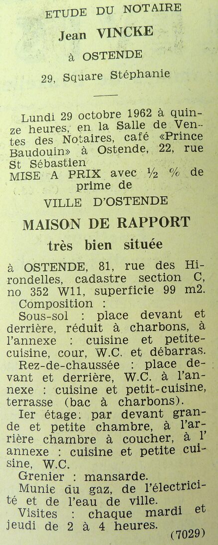 Advertentie : Etude du notaire Jean Vincke. Vente publique. Maison de rapport. 81, rue des Hirondelles, Ostende