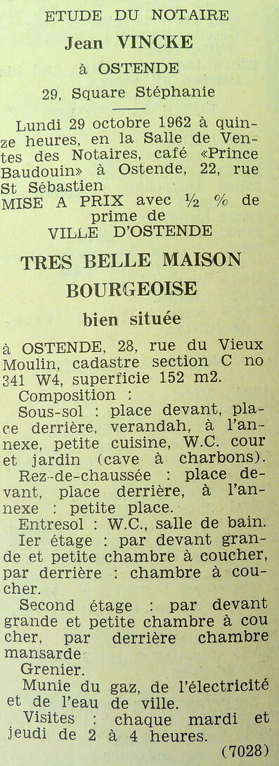 Advertentie : Etude du notaire Jean Vincke. Vente publique. Très belle maison bourgeoise. 28, rue du Vieux Moulin, Ostende