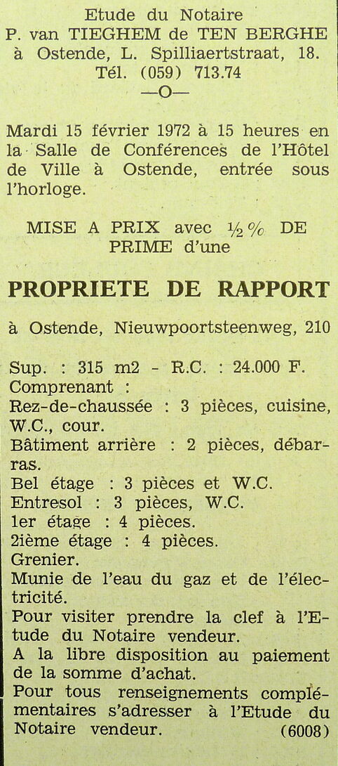 Advertentie : Etude du notaire P. van Tieghem de Ten Berghe. Vente publique. Propriété de rapport. Nieuwpoortsesteenweg 210