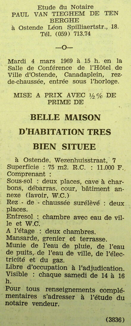 Advertentie : Etude du notaire Paul van Tieghem de ten Berghe. Vente publique. Belle maison d'habitation. Wezenhuisstraat 7