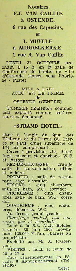 Advertentie : Etudes des notaires F.J. Van Caillie et I. Muylle. Vente publique. "Strand Hotel". Angle du Quai des Pêcheurs et du Parvis SS. Pierre et Paul