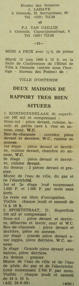 Advertentie : Etudes des notaires J. Lahaye et F.J. Van Caillie. Vente publique. Deux maisons de rapport. 1 : Koninginnelaan 40. 2 : Sportstraat 21