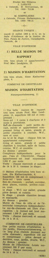 Advertentie : Etudes des notaires J. Lahaye et M. Simpelaere. Vente publique. 1 : Belle maison de rapport. Prof. Mac Leodplein 13. 2 : Maison d'habitation. Sinte Katharinaplein 6