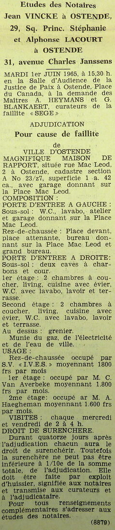 Omschrijving Openbare verkoop op vraag van de advocaten A. Heymans en G. Blankaert, curatoren van het failliete "SEGE". Trefwoorden ADVERTENTIES ; VERKOPINGEN WONING PROF. MAC LEODSTRAAT 2 WONINGEN HANDEL ; FAILLISSEMENTEN 14-05-1965 Auteurs Anoniem Bron Le Courrier du Littoral Pagina's 12 Print