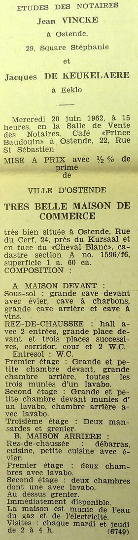 Advertentie : Etudes des notaires Jean Vincke et Jacques De Keukelaere. Vente publique. Très belle maison de commerce. Rue du Cerf 24, Ostende