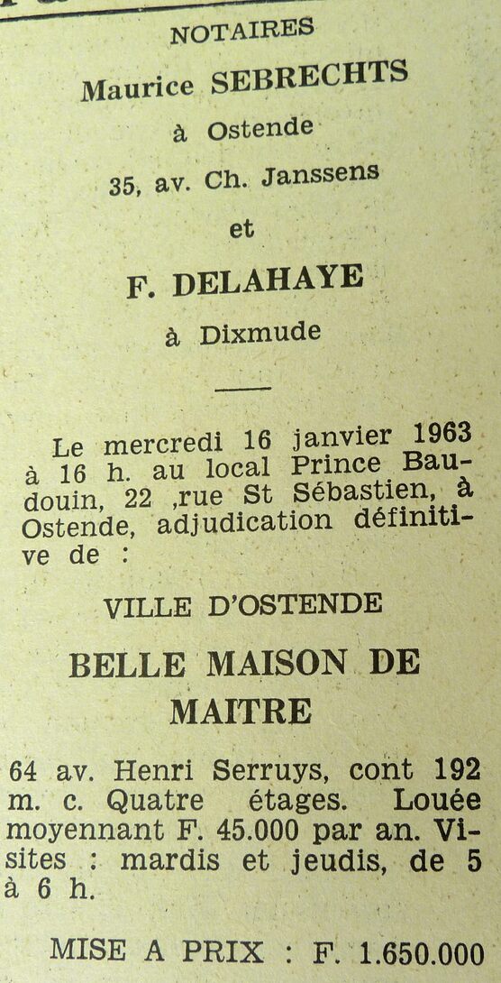 Omschrijving maison de maître = herenhuis Trefwoorden ADVERTENTIES ; VERKOPINGEN WONING HENDRIK SERRUYSLAAN 64 WONINGEN Plaatskenmerk ARCHIEF 117.8 B35 COUR1962 28-12-1962 Auteurs Anoniem Bron Le Courrier du Littoral Pagina's 10 Print