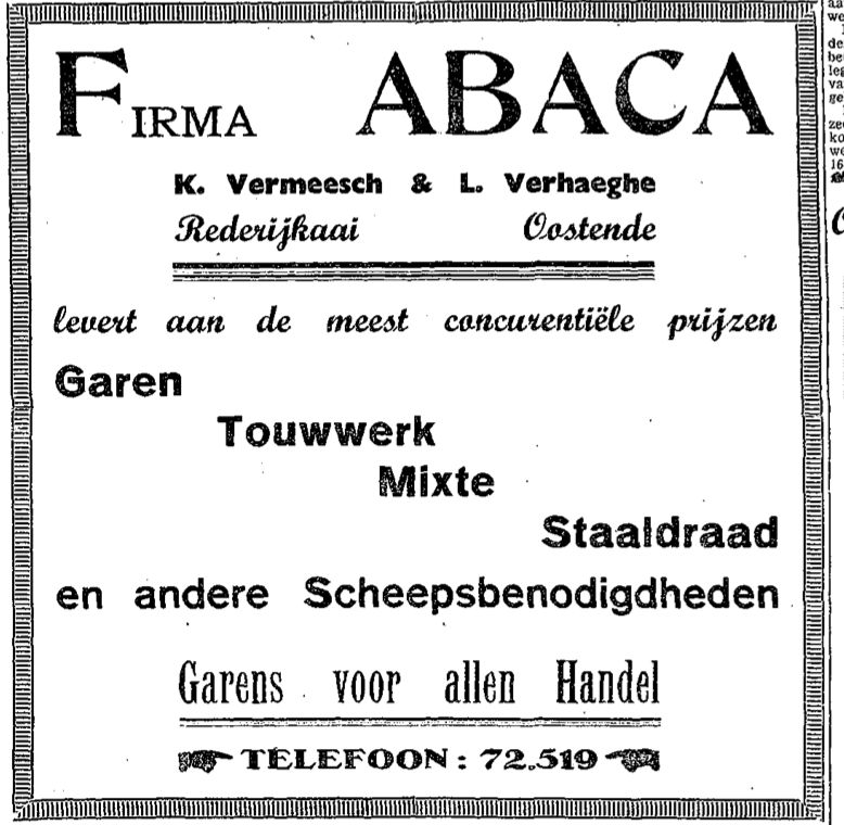 Trefwoorden ADVERTENTIES ; SCHEEPSUITRUSTINGEN FIRMA ABACA (VISSERIJBENODIGDHEDEN) REDERIJKAAI VERMEESCH K. (HANDELAAR) VERHAEGHE L. (HANDELAAR) Plaatskenmerk O.D.P.-archieven. Bibliotheek Kris Lambert VISS1947 19-09-1947 Bron Het Nieuw Visscherijblad Pagina's 2 Print
