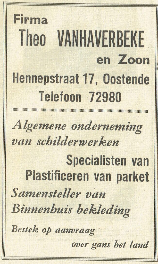Trefwoorden ADVERTENTIES ; SCHILDERWERKEN DECORATIEWERKEN VANHAVERBEKE THEO (SCHILDERWERKEN) HENNEPSTRAAT Plaatskenmerk DIGI ARCHIEF KRANTEN SPECIALE EDITIES 08-05-1964 Bron Het Laatste Nieuws Bijzondere Regionale Uitgave Oostende Pagina's 11 Print