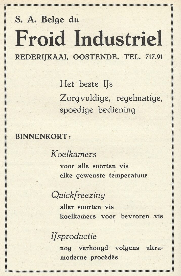S.A. Belge du Froid Industriel. Rederijkaai, Oostende. Het beste ijs. Zorgvuldige, regelmatige, spoedige bediening. Binnenkort : Koelkamers voor alle soorten vis. Elke gewenste temperatuur. Quickfreezing aller soorten vis. Koelkamers voor bevroren vis. Ijsproductie nog verhoogd volgens ultramoderne procédés.