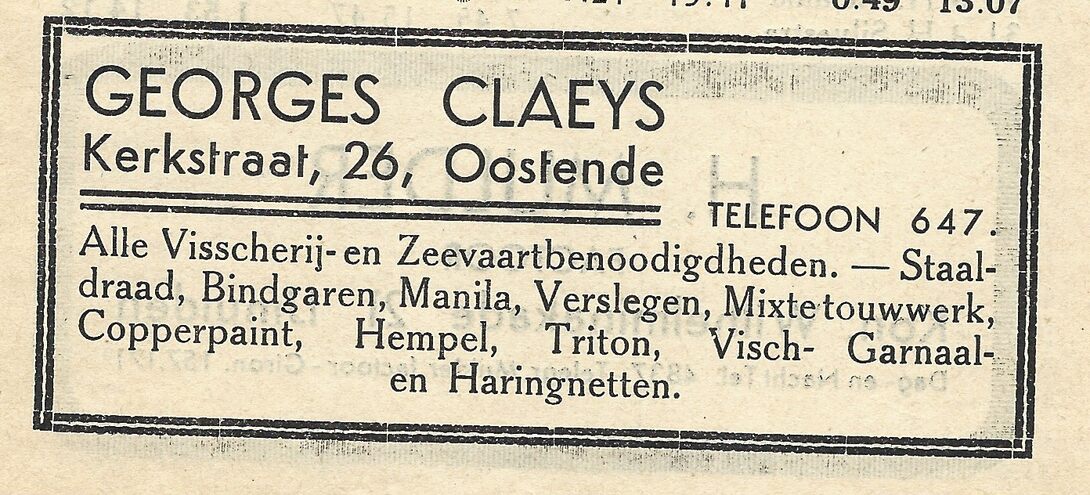 Advertentie : Georges Claeys. [Scheepsuitrustingen]. Kerkstraat 26 Oostende