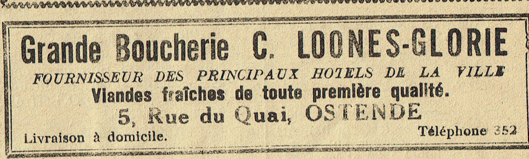 Advertentie : Grande Boucherie C. Loones-Glorie. 5, Rue du Quai, Ostende
